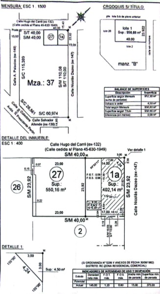 LA 27 CON 550,16 M2 DE TERRENO LIBRE CON 23 METROS DE FRENTE POR LA CALLE HUGO DEL CARRIL,