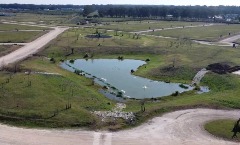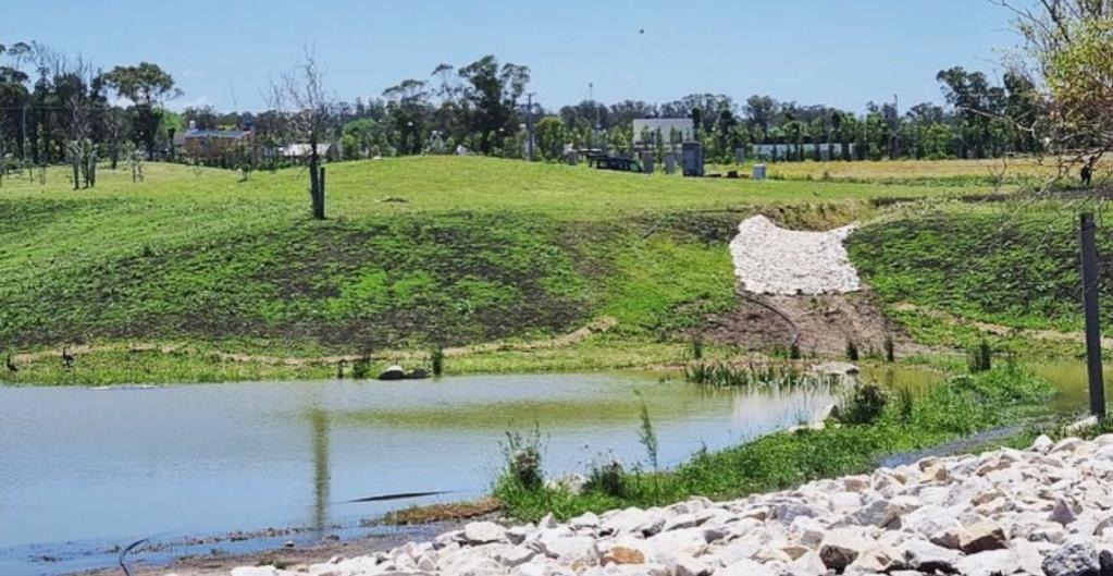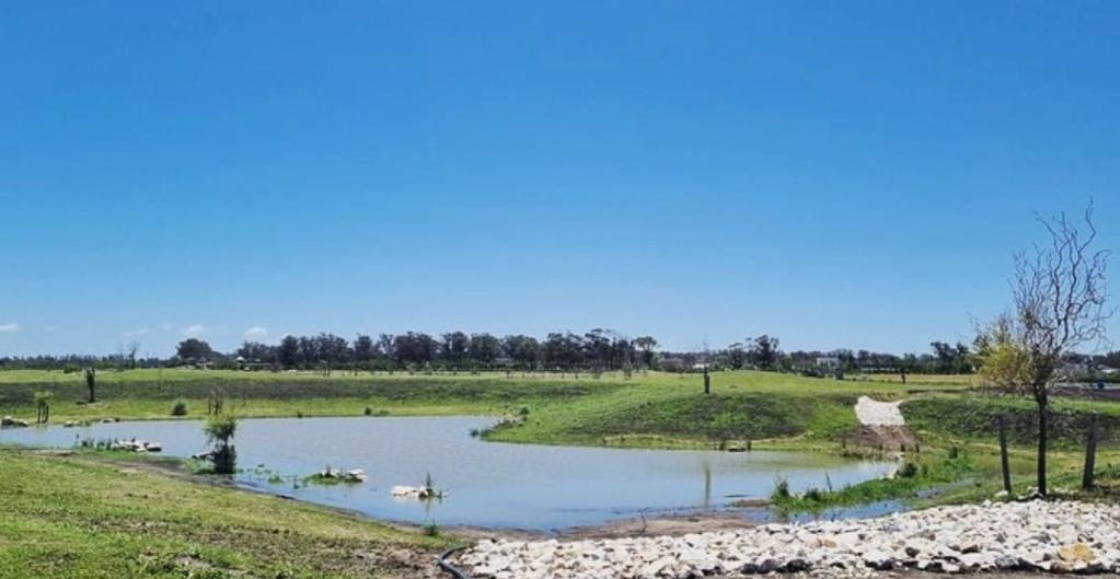 La segunda situación de paisajismo es la de acceso y S.U.M., en la cual el paisaje da la bienvenida al recién llegado. En el acceso el diseño hace de fusión entre el paisaje de costa del exterior con el de barrio parque del interior. Pastos ornamentales y pinos son los encargados de generar esa atmósfera. Al abrirnos paso hacia el interior del barrio un ombú nos recibirá reinando sobre una rotonda para dejarnos ver la laguna a sus espaldas. Laguna que bordearemos con el boulevard si tomamos hacia la izquierda o sobre la cual reposa la cubierta del deck del S.U.M. En ambos casos podremos ver inolvidables atardeceres tanto sea cuando regresamos al barrio luego de una jornada laboral, como cuando estemos compartiendo un momento en el S.U.M. Esta laguna, más allá de cumplir con un rol contemplativo dentro del paisaje, también está diseñada para alojar en su cuenca el triple del agua de lluvia recibida durante un torrencial, lo cual funciona como regulador pluvial garantizando al barrio el funcionamiento hidráulico de su cuenca.