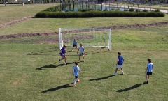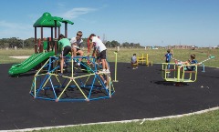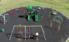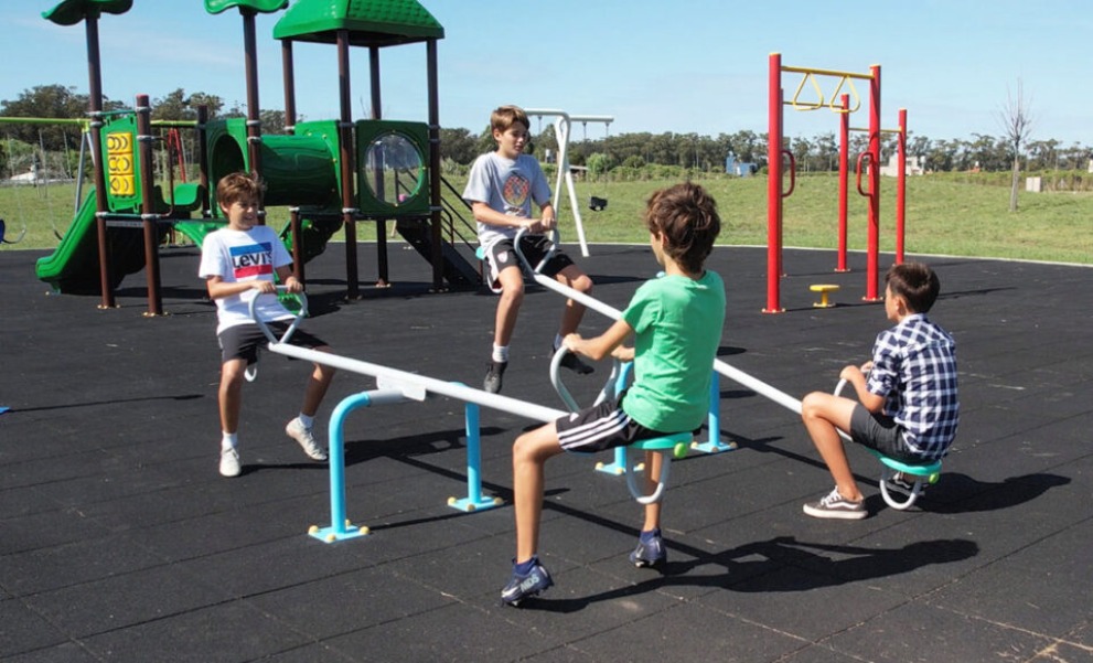 Y en tercer lugar, pero en un mismo escalafón de importancia, tenemos el área de juegos del parque. Éste importante lugar lo ubicamos en el corazón del barrio, donde todas sus “venas” o vías circulatorias convergen. La plaza está dividida en cuatro regiones, organizadas según cada grupo etario y sus intereses de juego. Imaginemos una torta con tres porciones alrededor de una porción central. Esas porciones perimetrales corresponden a las distintas zonas de juego (infantes de primera niñez, infantiles de segunda niñez y preadolescentes). Al centro, la porción destinada a plaza aeróbica para los adultos y adolescentes. Este sector fue elegido especialmente para los adultos que quieran acompañar a sus hijos así, desde allí mientras se ejercitan, tienen dominio visual de cualquier de las partes destinadas a recreación infantil.