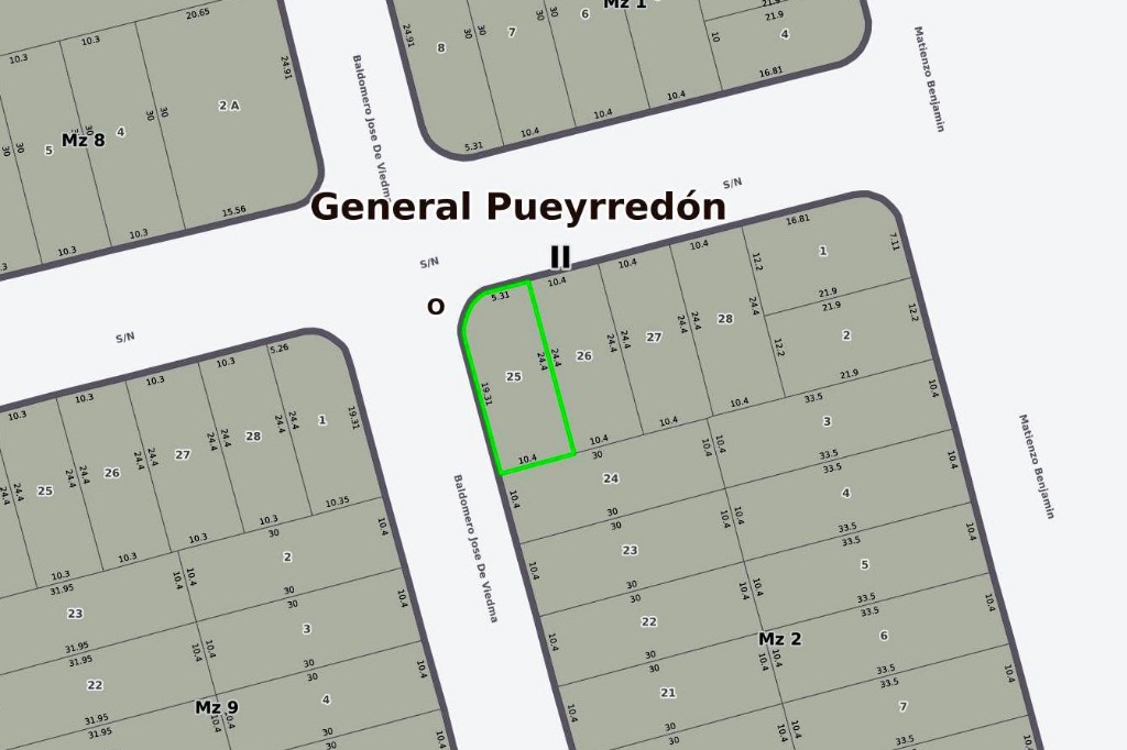 LOTE DE TERRENO EN ESQUINA CON UNA SUPERFICIE DE 248,21 M2 COMPUESTO POR 19,31 METROS DE FRENTE SOBRE CALLE VIEDMA , OCHAVA DE 10 METROS Y POR SU OTRO FRENTE 5,31 METROS SOBRE CALLE MANUWAL.SE SITÚA A SOLO 100 METROS DE LA RUTA 2 .